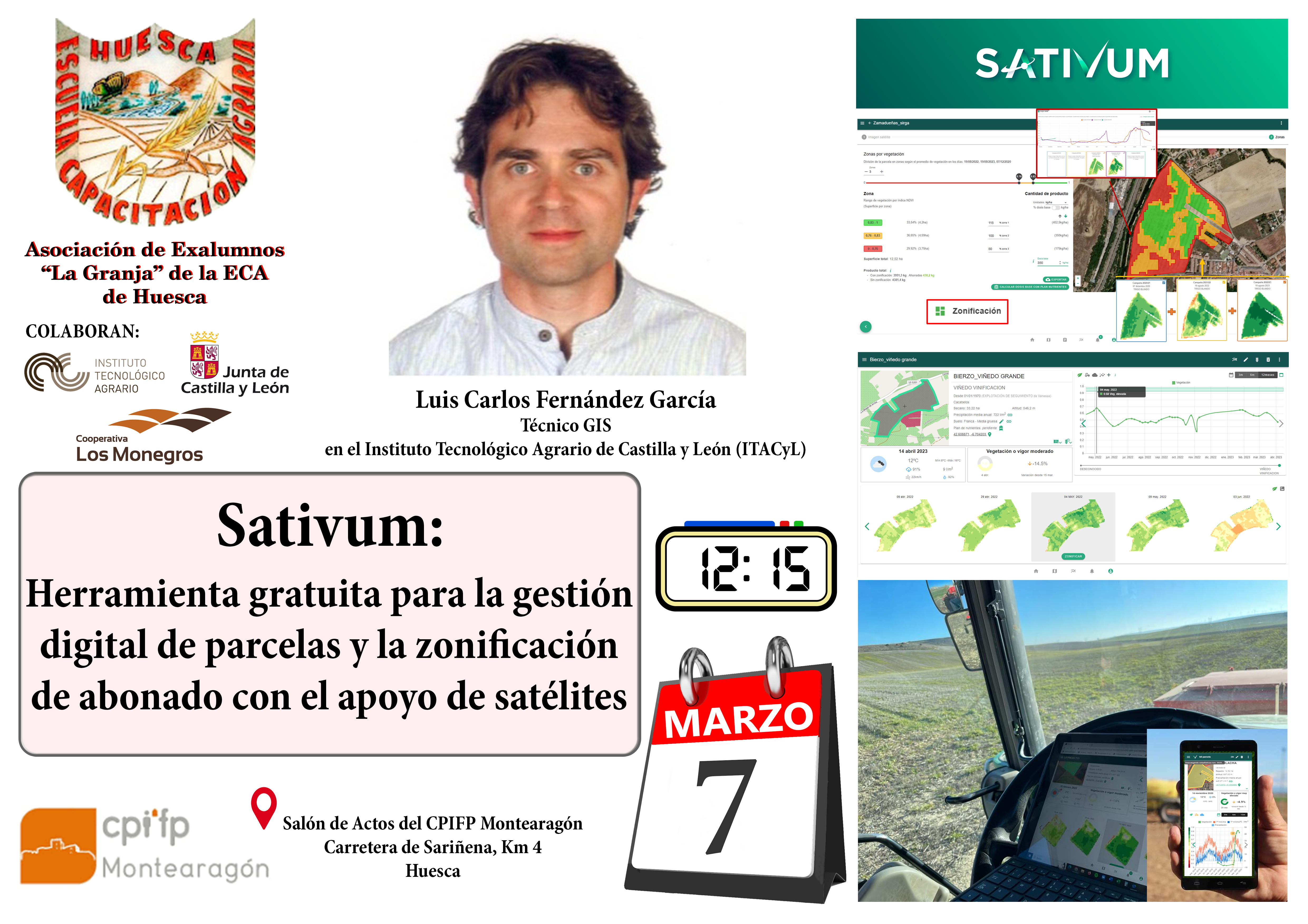Dentro de los actos organizados por la Asociación de Exalumnos "La Granja" de la Escuela de Capacitación Agraria de Huesca (actual CPIFP Montearagon) el próximo día 7 de marzo a las 12:15 h. tendrá lugar la conferencia de Luis Carlos Fernández García (Técnico GIS del Instituto Tecnológico Agrario de Castilla y León) "Sativum: herramienta gratuita para la gestión digital de parcelas y la zonificación de abonado con el apoyo de satélites".